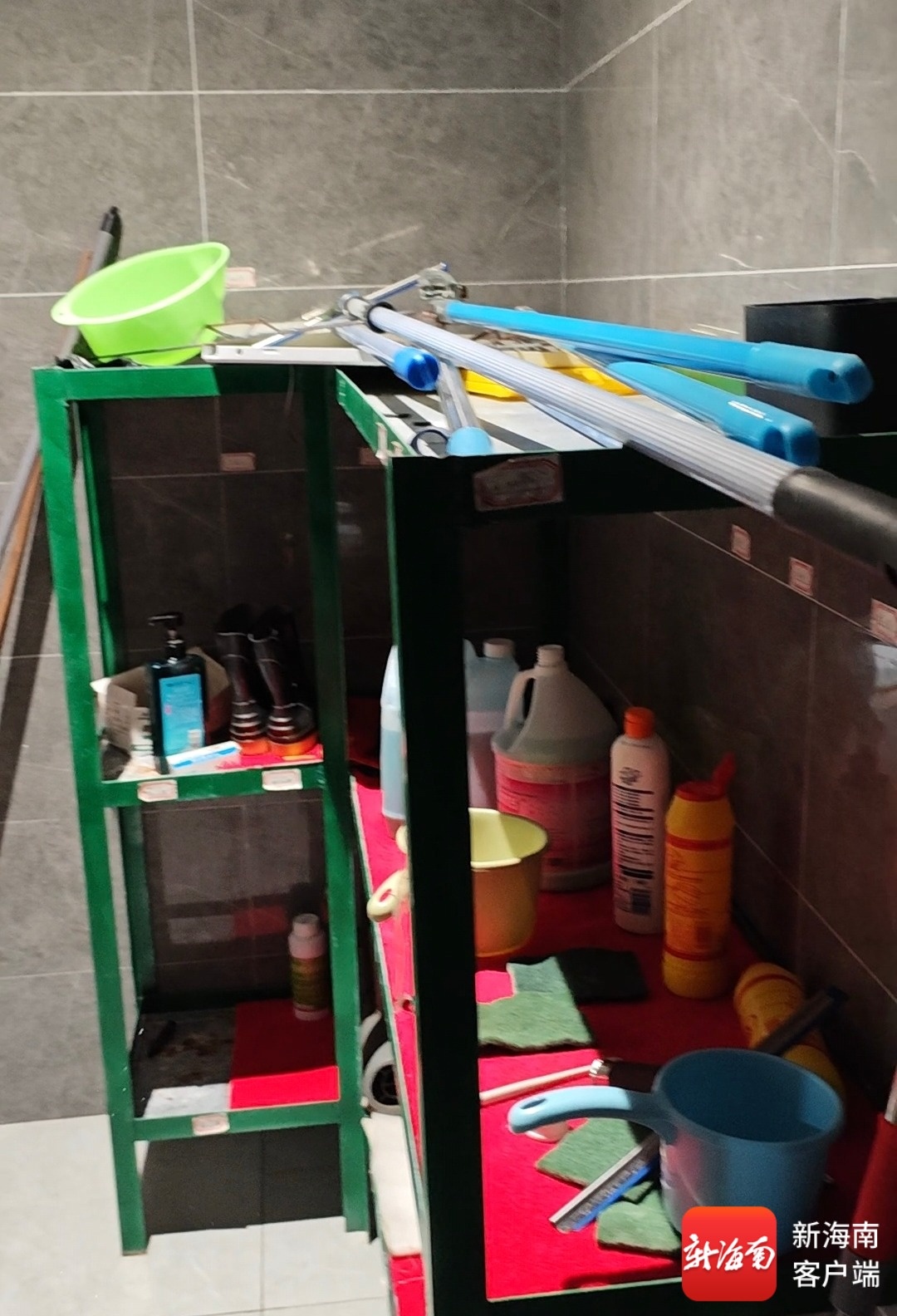 记者看到,他们的东西间设备比较全,除了拖把、扫把,置物架上还有手套、抹布和清洁液等。